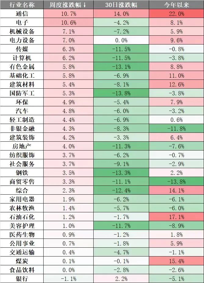 本周申万一级31 个行业全线普涨,通信、电子行业领涨全市场,成长风格全面占优,银行板块小幅收跌。