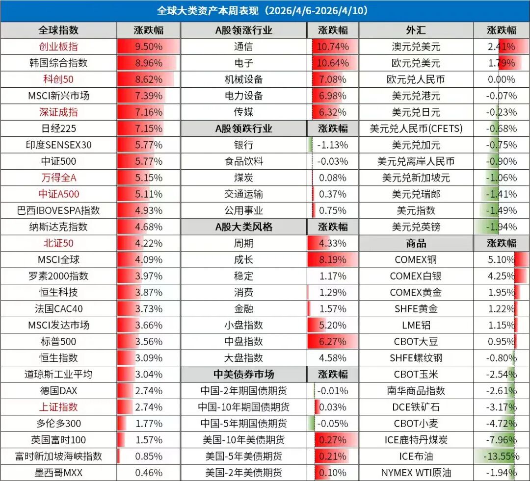 海外方面,中东地缘局势缓和成为本周主线,美以伊达成停火协议推动市场风险偏好显著回升。美股三大指数全线反弹,标普500、纳指连续多日收涨,科技板块领涨,AI算力、半导体等成长风格重新占优。美债收益率走势分化,短端受降息预期支撑小幅下行,长端则因油价冲击下的通胀担忧维持高位震荡,10年期美债收益率徘徊于4.3%附近。美元指数承压下挫,避险情绪降温推动资金流出美元,黄金在避险退潮与美元走弱交织下高位整理。此外,加密货币受风险偏好回暖带动,比特币一度突破72000美元。